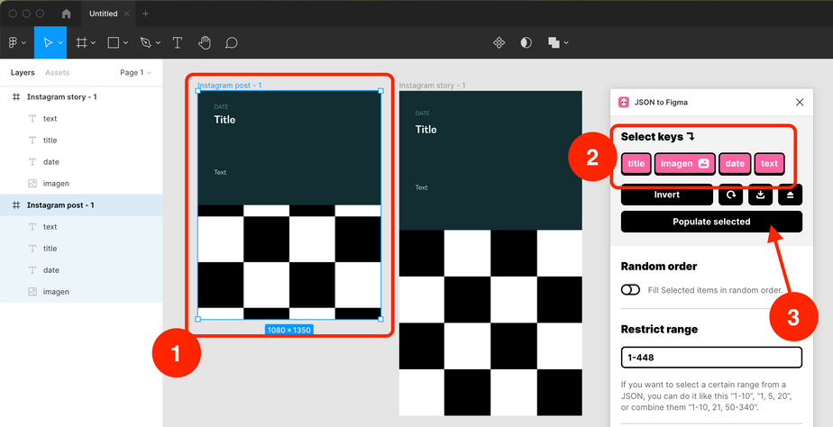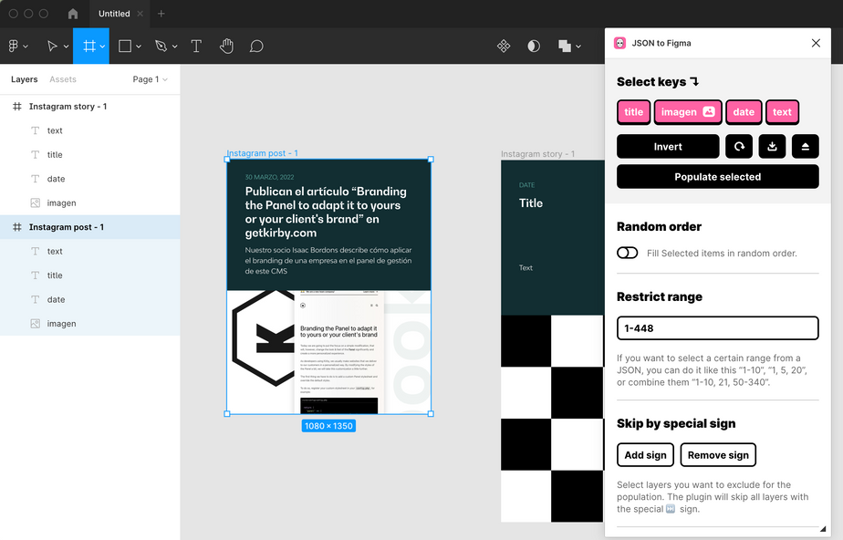 Now select the frame “Instagram post - 1” and the keys to use in the plugin, then click on the "Populate selected" button: