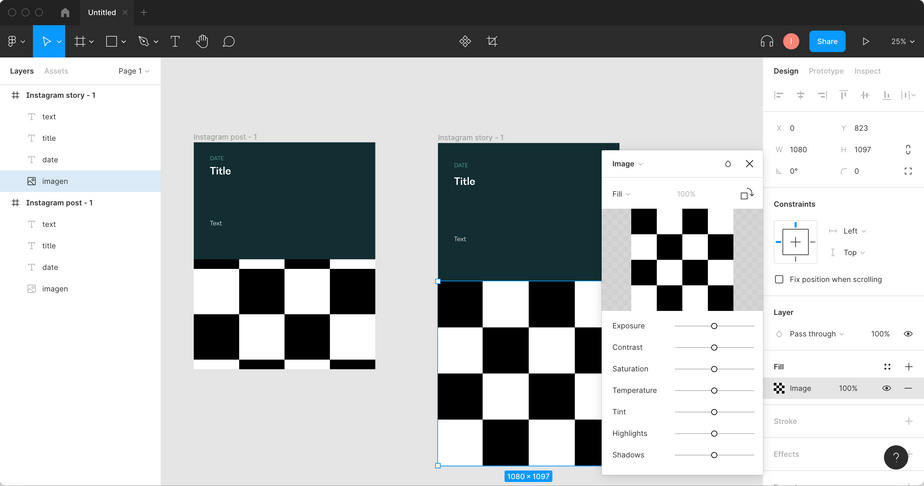 Note that the titles of the layers must be the same as the keys of the JSON we created: title, imagen, date, and text. The image will be a rectangle with the fill as an image.