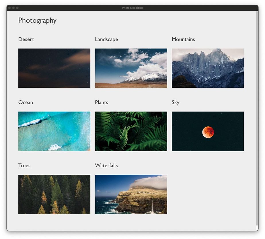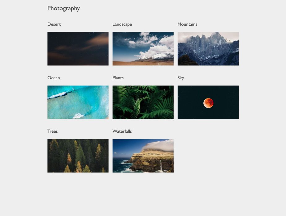 This uses the data pulled in from Kirby to generate a list of the available Photography articles. At this point (and after a little CSS!) we should have something like this in the browser: