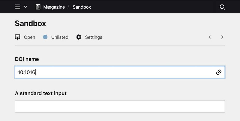 In this recipe, we start with the basics of creating a field from scratch using a Vue.js single file component, and then build on this by reusing parts of Kirby's UI Kit. We will deviate a little from the example in the videos though, and our final result will be a text input for DOI names, with a link that allows us to verify the input by calling the link https://www.doi.org/ suffixed with the field input.