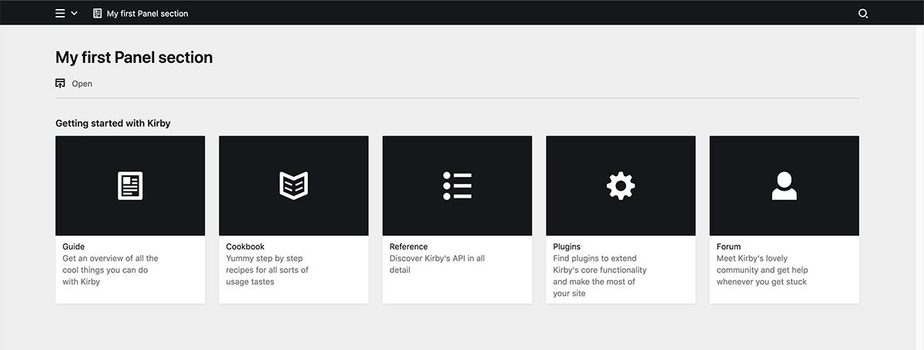 Inside the data array, we use the keywords the k-collection component expects, and add a value to each. Et voilà , there is our first section entry in the Panel.
