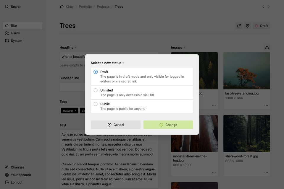 Kirby's page states give you full control over your publishing workflow. This allows you to define access to content, to filter content by status criteria and much more.