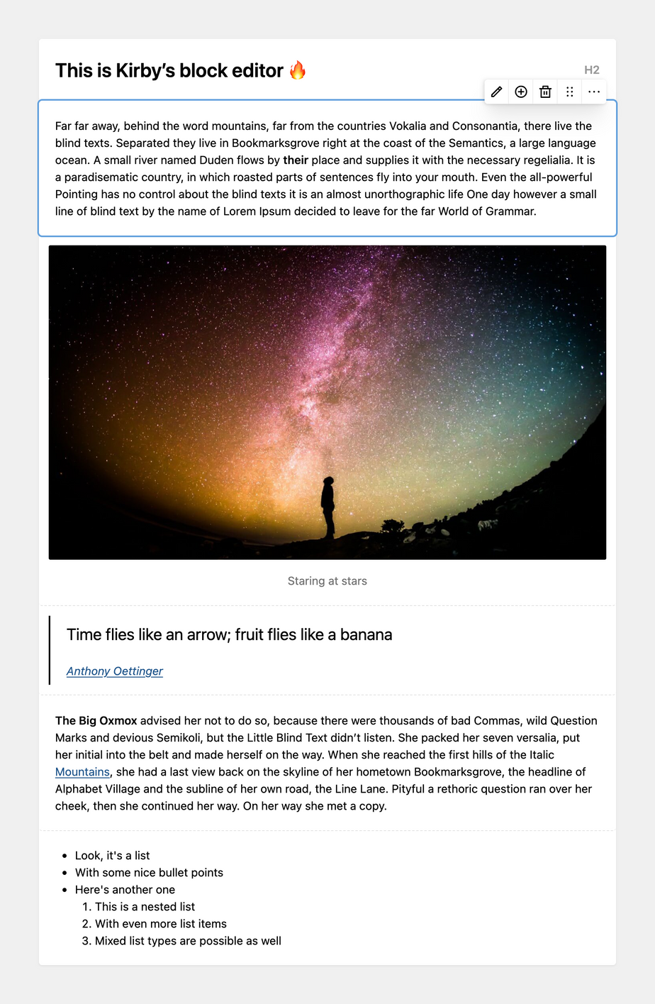 This is where Kirby's blocks and layout fields shine brightly: Blocks are the perfect solution for complex single-column layouts and long-form text with images, galleries, code, embedded media and more. With the layout field, you take this one step further to arrange blocks in multiple columns to build complex page layouts.