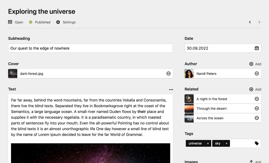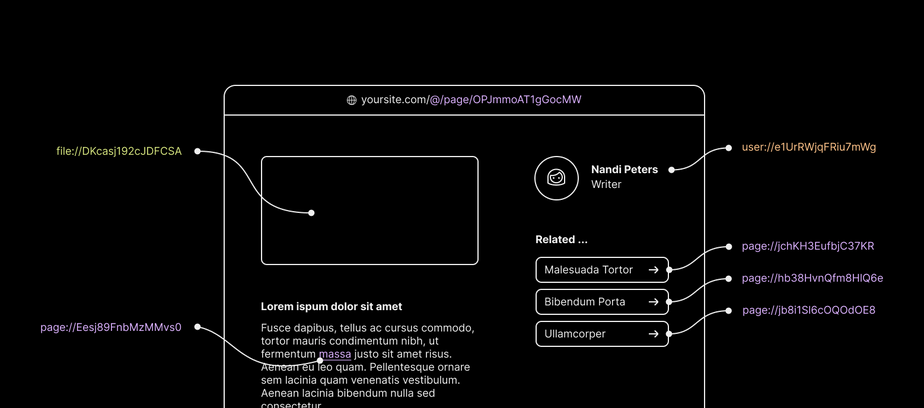 Kirby’s unique IDs make it easy to refer to any page, file or user, no matter where on the site they are stored. Use them to build persistent and reliable relations for links, embedding and more – even after moving or renaming the target.