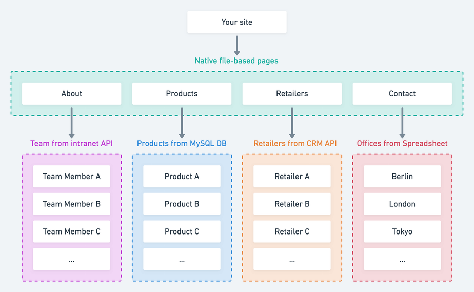 With Kirby's architecture you can combine native, file-based pages with pages from any other data source – from databases, external APIs, Excel sheets – you name them.
