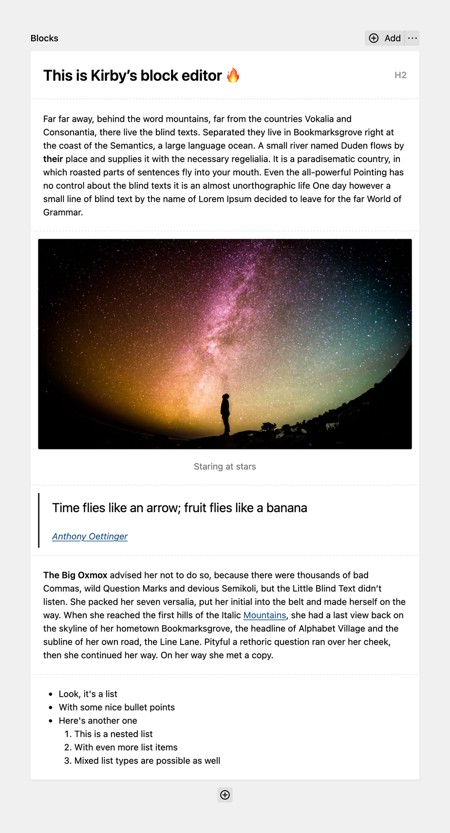 Kirby's built-in blocktypes are not enough? Create your own! Check out our extensive documentation on custom block types, from basic to advanced: