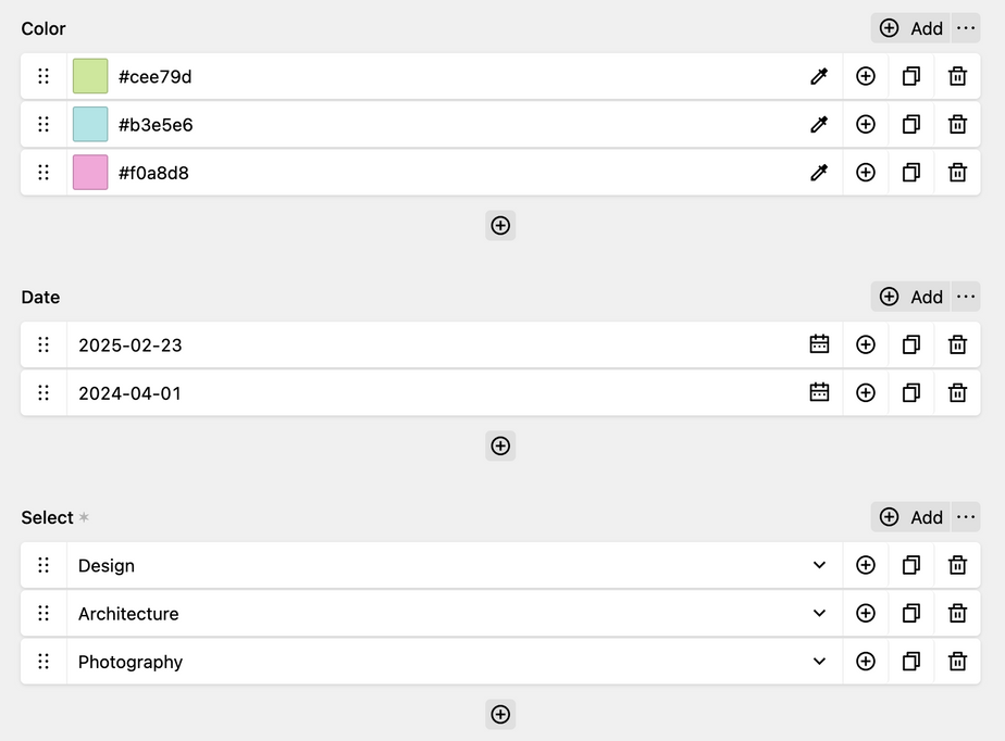- | The options for the field to repeat. Supported field types are color, date, email, number, select, slug, tel, text, time, url. |