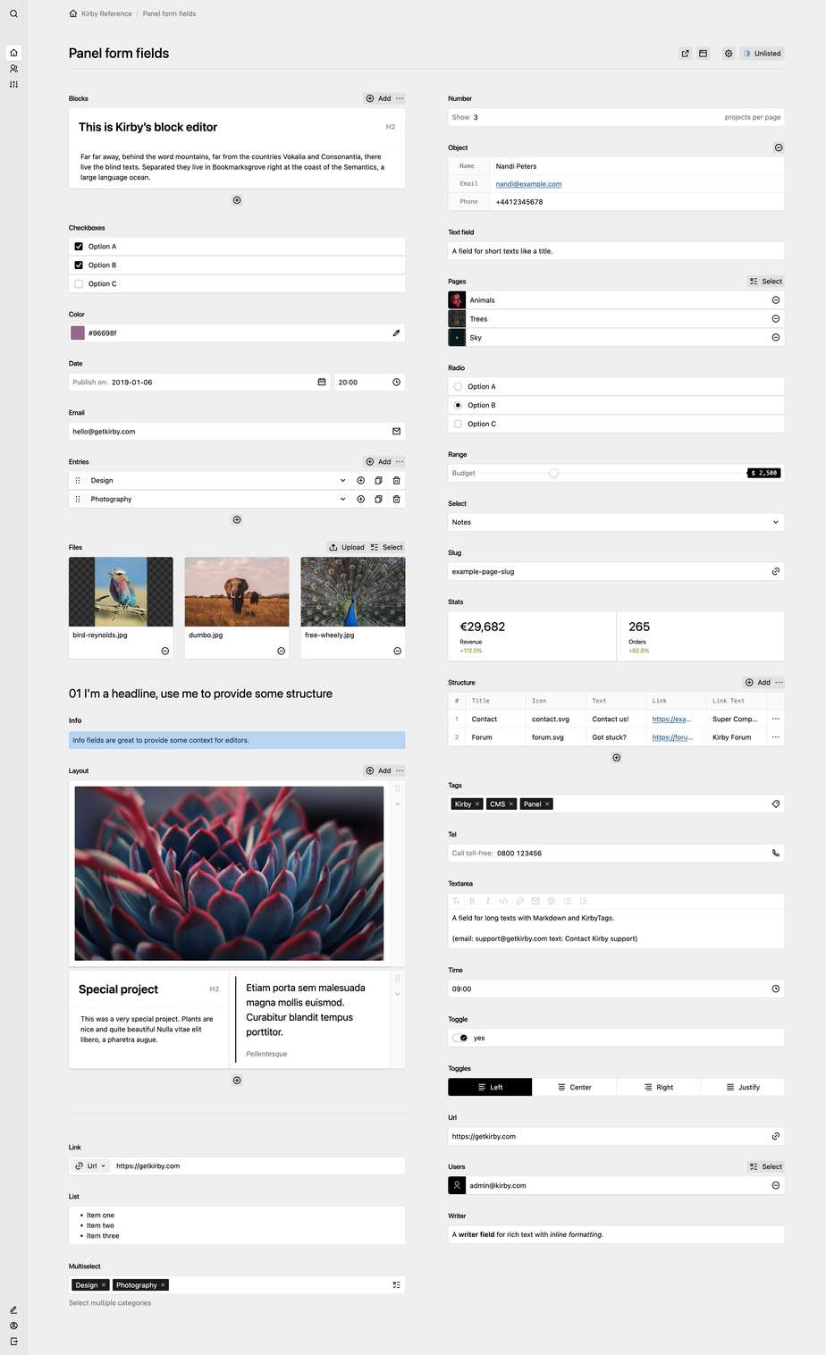 The Panel offers a wide range of field types that you can use to structure your content in the best possible way. From a simple text field over multiselect fields for users, files or pages to the structure field for multiple entries like addresses or events, you can already do a whole lot. And if that is not enough, you can create any custom field you need. The possibilities are endless.