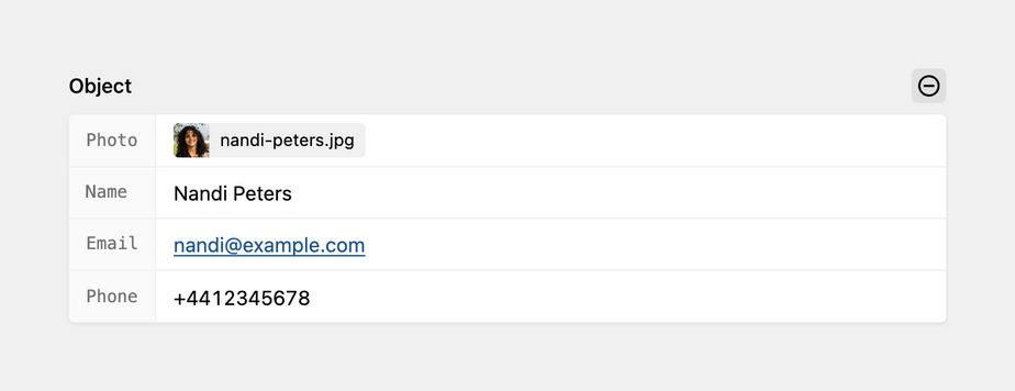 The object field allows to create data objects. This is handy for more complex settings, isolated entities or nested data.