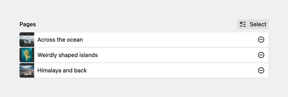 By default, the pages field lets you select pages from the complete page index. You can limit these options using the query property:
