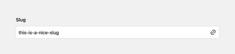 The slug field creates a text input that automatically sanitizes the typed value with our built-in sluggify method. It's perfect if you want to create IDs or class names for HTML elements or paths for files or URLs.