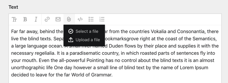 The file upload and select button is super useful if you want to embed images or other files right in your text.