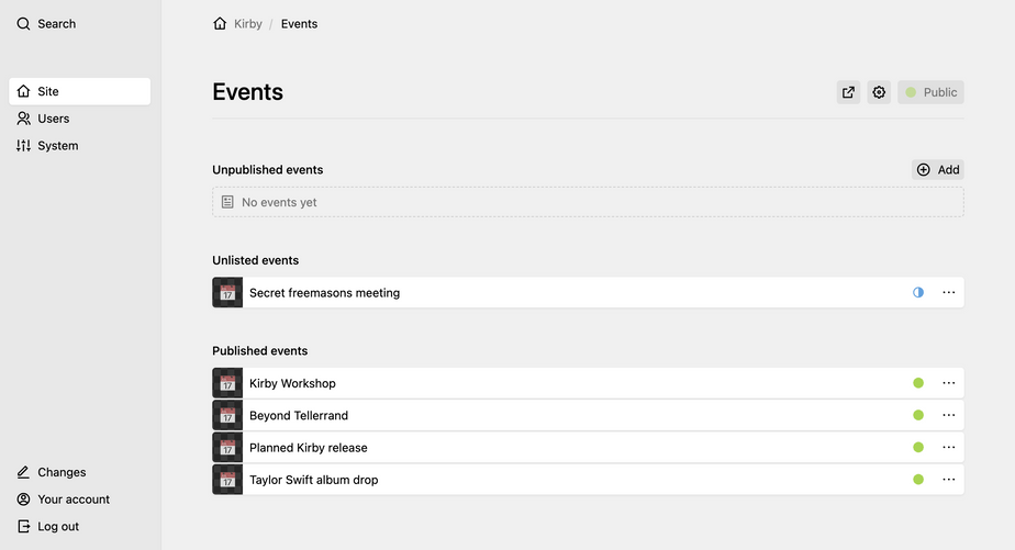 $events = $page->children()->listed();