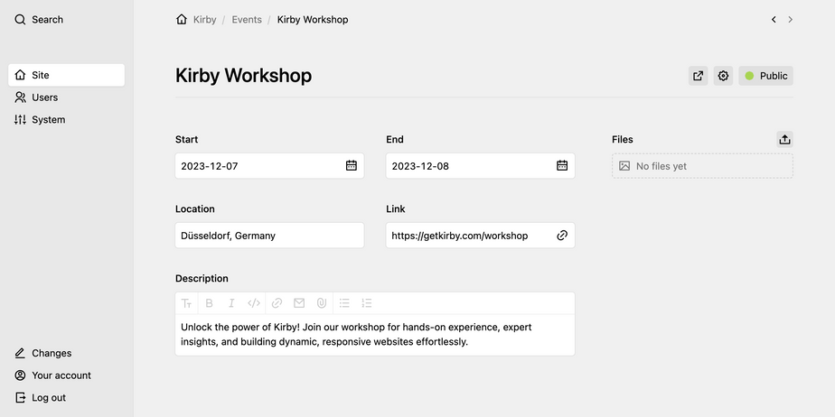 Note that for the example to work, a page with the slugevents needs to exist and have an events.txt file inside. Make sure that this events page is not in draft state anymore, otherwise the site.find("events") query won't be able to find it. For a draft, you could change the parent query to kirby.page("events").