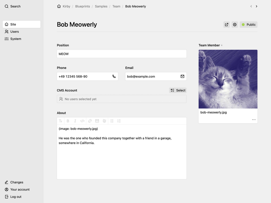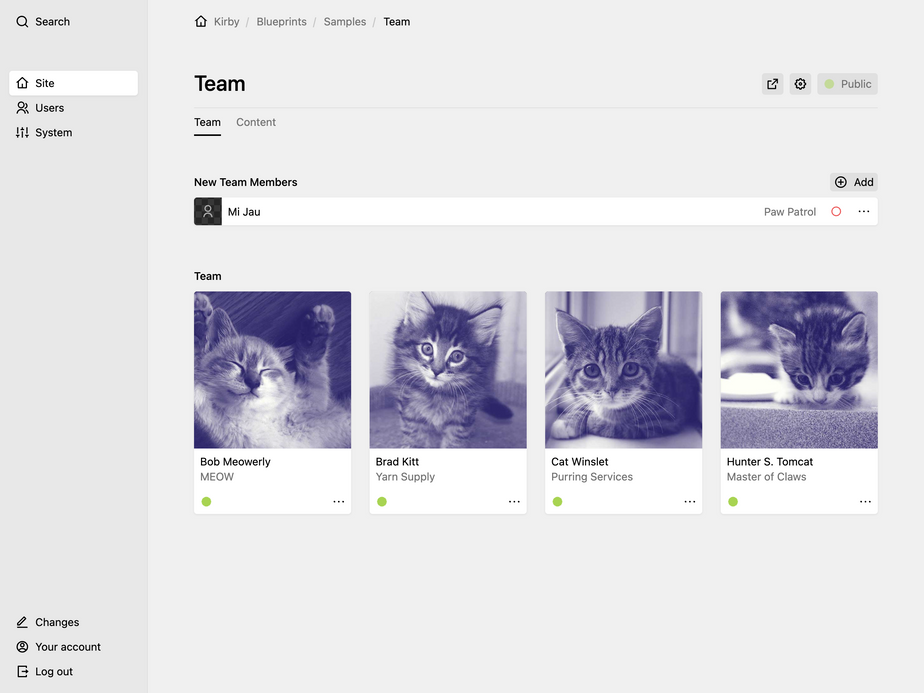 The Team page example consists of an overview with a card layout, and subpages shown in pages section.