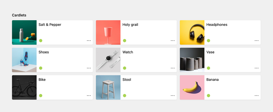 Section layout. Available layout methods: list, cardlets, cards, table. |