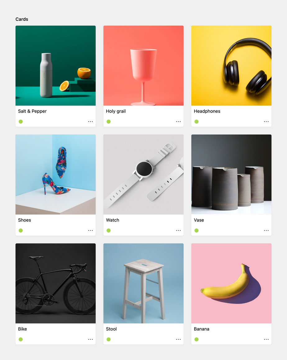 The size option controls the size of cards. By default cards are auto-sized and the cards grid will always fill the full width. With a size you can disable auto-sizing. Available sizes: tiny, small, medium, large, huge, full
