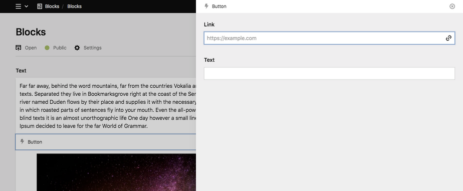 If you want to go one step further, you can turn your button block into a tiny WYSIWYG editor with just a bit more work. Examples for such WYSIWYG editing blocks are our text, heading, quote or code blocks.
