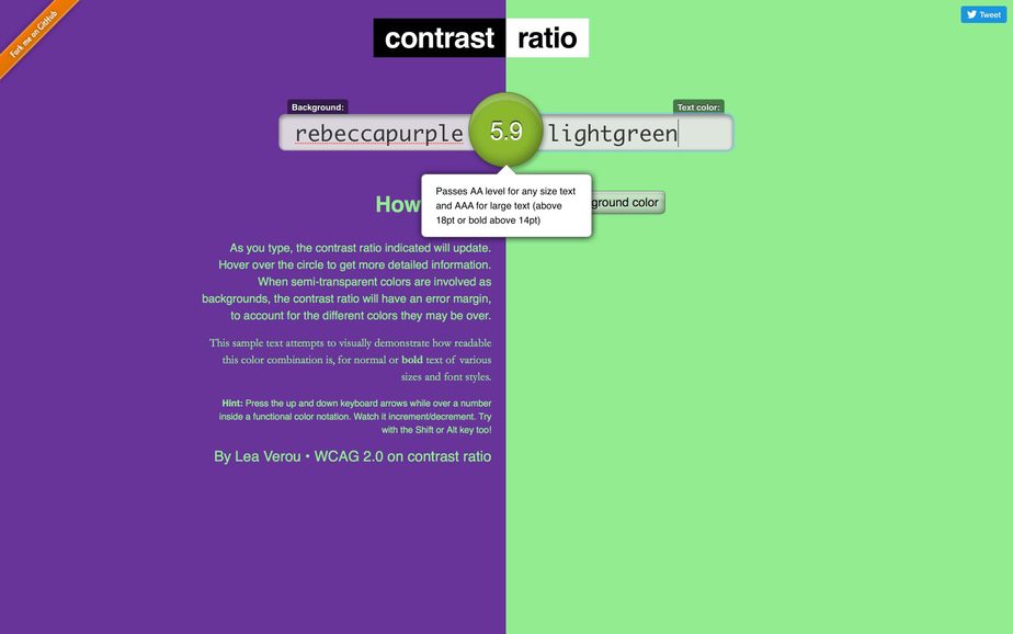 Use the Contrast Ratio online tool by Lea Verou to get instant information about the contrast ratio of foreground and background colors.