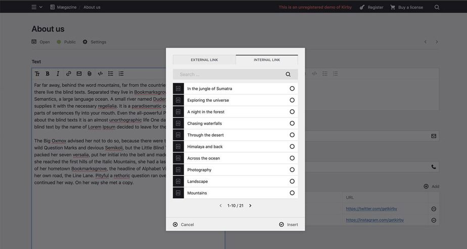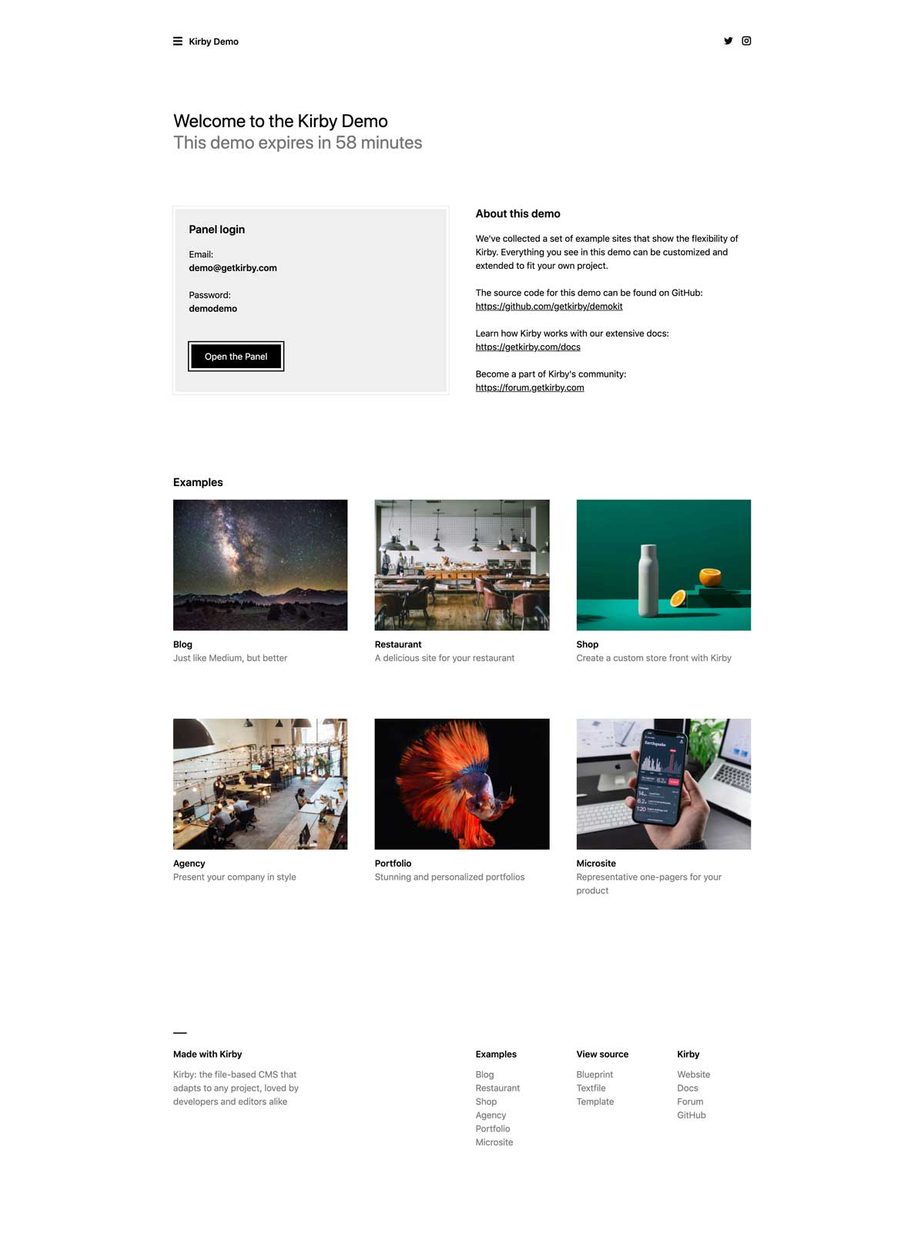 As a major step in this direction, here comes Kirby demo: discover Kirby instantly without installing. The demo features multiple site types integrated into a single site, showcasing the extreme flexibility of Kirby for your projects–big or small. As a demo user, access the Panel and explore Kirby's user-friendly editing interface: add blog posts, create new products, upload images to the gallery, edit and add users, and more. Check it out and let us know what you think! And if you are curious to know how we made it, visit the repo on GitHub.