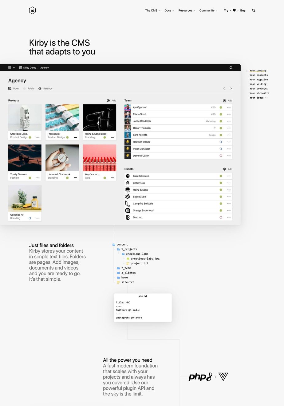 The new website isn't just about a few design changes. The main idea was to tell a better story about what Kirby really is and can do for you as designers, developers, content creators or users.