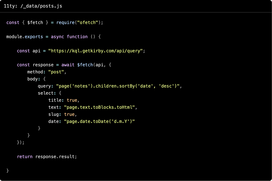 It uses Kirby's query language (KQL) to fetch articles from our KQL playground.