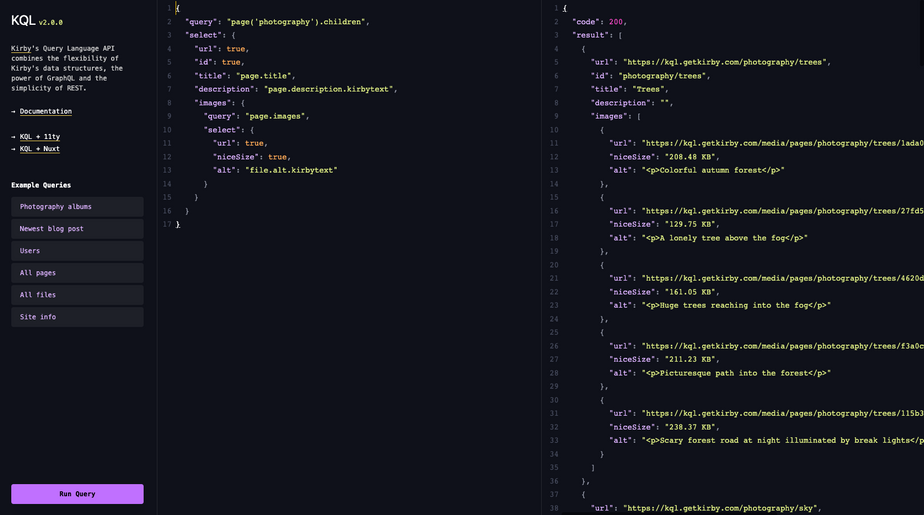 Kirby's Query Language API combines the flexibility of Kirby's data structures, the power of GraphQL and the simplicity of REST. KQL 2.0.0 comes with all the new query syntax improvements from Kirby 3.8.3 and a fully refactored code base. Get started with the new KQL Playground which provides a set of example queries. Connected to our Starterkit, you can play around with your own queries.