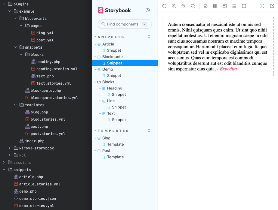 Generate Storybook stories from snippets and templates with the Kirby Storybook plugin.