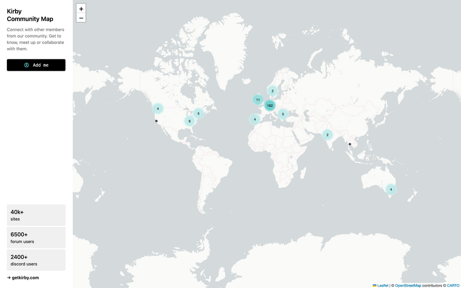 Get to know fellow Kirby users, organize meetings, collaborate. Our community map is the perfect place to find people in your area. Not there yet? Add yourself to the map: https://community.getkirby.com/