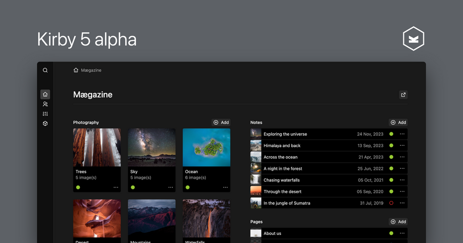 Today we are sharing the very first alpha version of our new major version, Kirby 5 with you. As an alpha, this version is far from complete yet, so things will still change, and we will also add new features until the release at the end of this year.