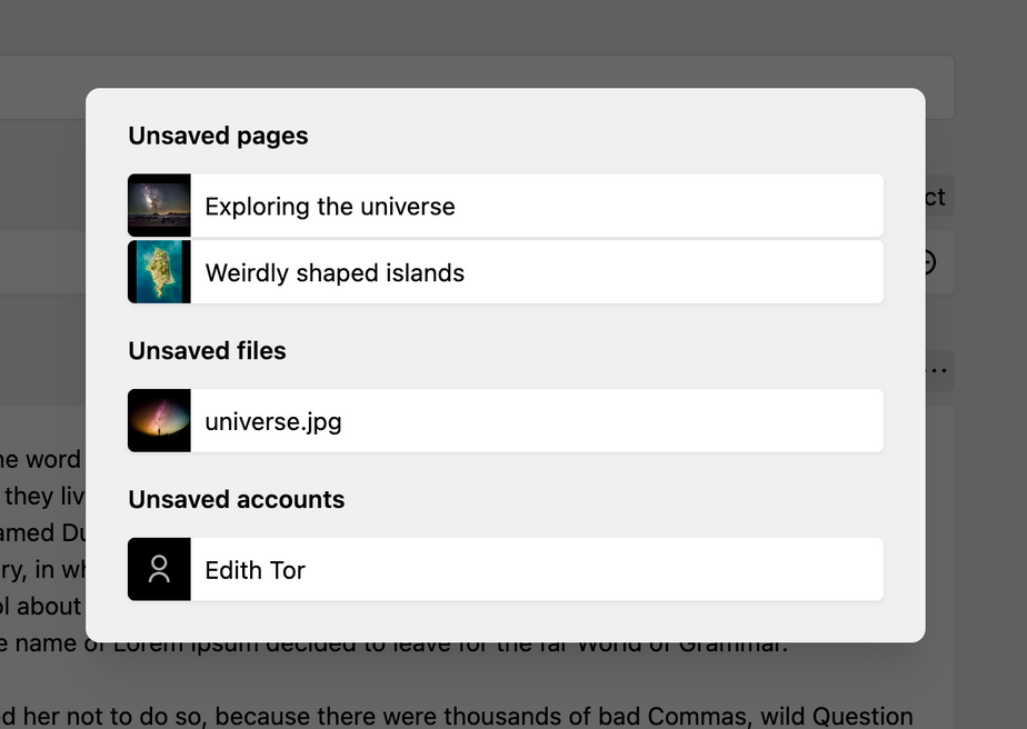 All changes by everyone in the team - not just the current editor - are now listed in the Changes dialog (accessible via the “Changes” menu item in the sidebar) and grouped by type (page, user, file). Now everyone in the team can directly use the dialog to jump to changes by other team members and preview them directly on the fly, even while someone else is still actively working on them.